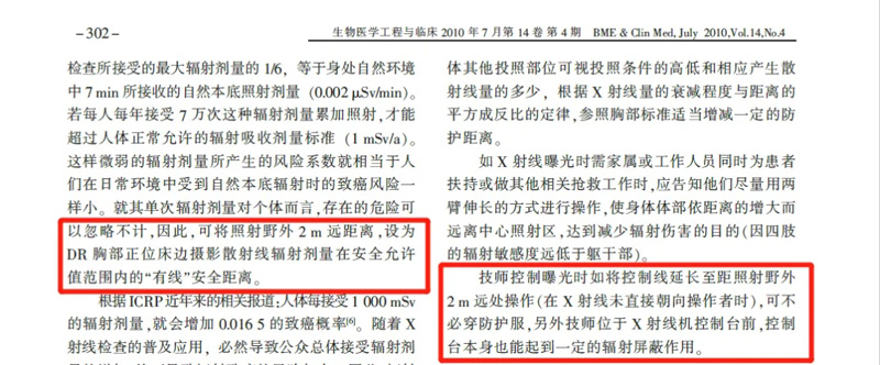 移動DR是可以在病房進行檢查的X射線檢查機器。移動到各個科室對病患進行檢查。但是它又不像放射科有輻射屏蔽條件。那么移動DR在檢查過程中,同個病房的病人跟檢查的醫護人員需要怎么樣的防護呢?一般危重病人,手術室中搶救的病人,不能移動的病人才能使用移動DR。移動DR的電流在400-650mA,而其他普通DR的電流在600-800mA之間。在胸片拍攝的工作電流一般大概在250mA。有使用不定時不固定位置的特點。胸部放射線輻射劑量均低于自然本底照射值。《數字X射線攝影機床邊胸部攝影時周圍散射線量測量》距照射野外2米有限安全距離,其散射線劑量低于人體7分鐘所接受的自然本底照射劑量。自然本底環境照射野外2.5米無線安全距離。