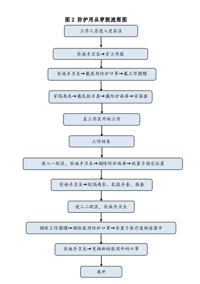 除X線電離防護外,方艙CT檢查需對操作技師、患者及家屬做相應的防護。根據國家衛生健康委辦公廳印發的《新型冠狀病毒肺炎防控方案》(第五版)[6]對于在新型冠狀病毒感染的肺炎疫情防控工作中不同的工作人員其防護等級是不同的。如是疑似患者,技師則執行二級防護。方艙CT內,設置清潔區、一脫區、二脫區、免洗手消毒液、一次性防護服、一次性乳膠手套、鞋套、洗手液。技師需經多次反復訓練穿脫流程和檢查流程,并做好總結,考察合格方可上崗。為此我科花費了大量時間進行了防護用品穿脫,消殺,接診流程的演練,并做總結和改進措施。(附件1所示),防護用品穿脫流程如圖2所示。