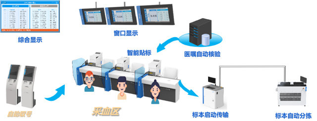 采血流程:患者到窗口采血-掃碼或讀就診卡-核對檢驗項目-打印標簽-選擇試管-粘貼試管-護士采血。人工采血存在問題人工選管、打印、粘貼,勞動強度大。容易出現人為錯誤。貼歪、貼倒(不能識別)。位置錯誤(流水線無法識別)。視窗覆蓋(無法觀察血液情況)。可能出現漏采或多采血。智能采血設備解決采血人的排隊難題,智能采血管理系統把采血管的準備工作自動化,縮短等待時間。采血流程需要全面的優化,報到取號,65歲以上老人優先。智能叫號不需要長時間的排隊。采血管容量大,處理速度快,能有效加快采血速度,提高采血服務質量。自動化代替了傳統人工的操作模式。自動識別自動貼標,自動標本核收。大大的減少人工誤差。也減少繁雜的采血前準備,系統具有諸多優勢,將為客戶帶來全新的體檢體驗。