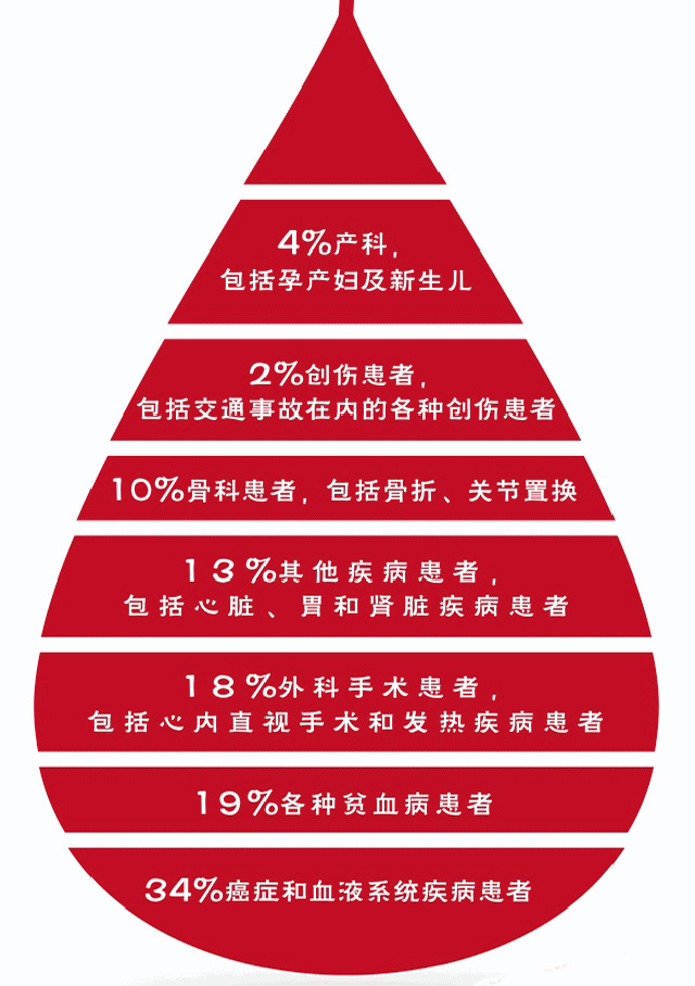 也就是大家獻的血經(jīng)過分離檢驗存儲后送到各大醫(yī)療機構用來對有需要輸血的病人輸血救治。其實我們很多人有個認識誤區(qū),以為血液就是在災難時候才需要獻血,其實醫(yī)院每天有不少病人需要各種血液成分來搶救治療。大量失血的病人,外傷大出血,大型手術跟其他原因低血量,輸血來補充血液,血液大部分用于癌癥跟血液疾病的病人。慢性失血、紅細胞被破壞或白蛋白合成不足。如血友病、血小板減少癥或血小板功能障礙。凝血異常導致失血,具體來講血液有個使用比例數(shù)據(jù)。有助于挽救生命延長生命提高生活質量。