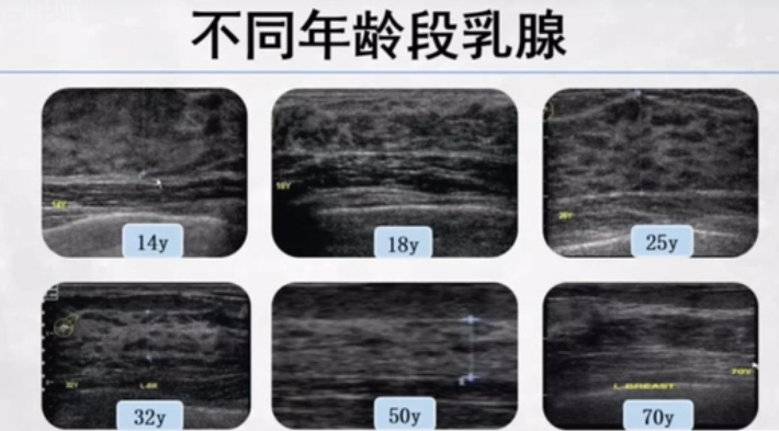 正常乳腺超聲聲像圖,乳腺超聲設備高分辨力超聲能夠清晰顯示乳腺及其周圍組織的解剖結構。可以看到乳腺腺體,高回聲的皮膚層,低回聲的皮下脂肪層,然后是乳腺的腺體結構,那么后方的是乳腺腺體后脂肪,胸大肌,胸膜,乳腺的支撐機構韌帶。乳腺掃查的時候乳頭乳暈區的掃查。乳頭的病變率還是有的。使用多量耦合劑觀察,對乳頭非常細致的掃查。觀察乳腺乳頭的情況跟改變。乳頭邊界清楚的外凸圓形結節,均勻的中等回聲,后方都伴有聲影。乳腺導管與小葉,類似一小串葡萄。