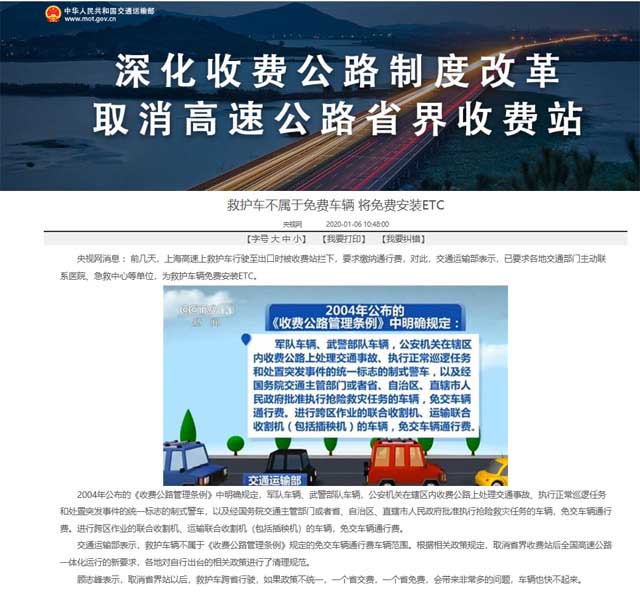 報道稱: 央視網(wǎng)消息 :前幾天,上海高速上救護(hù)車行駛至出口時被收費(fèi)站攔下,要求繳納通行費(fèi),對此,交通運(yùn)輸部表示,已要求各地交通部門主動聯(lián)系醫(yī)院、急救中心等單位,為救護(hù)車輛免費(fèi)安裝ETC。 2004年公布的《收費(fèi)公路管理?xiàng)l例》中明確規(guī)定,軍隊(duì)車輛、武警部隊(duì)車輛,公安機(jī)關(guān)在轄區(qū)內(nèi)收費(fèi)公路上處理交通事故、執(zhí)行正常巡邏任務(wù)和處置突發(fā)事件的統(tǒng)一標(biāo)志的制式警車,以及經(jīng)國務(wù)院交通主管部門或者省、自治區(qū)、直轄市人民政府批準(zhǔn)執(zhí)行搶險救災(zāi)任務(wù)的車輛,免交車輛通行費(fèi)。進(jìn)行跨區(qū)作業(yè)的聯(lián)合收割機(jī)、運(yùn)輸聯(lián)合收割機(jī)(包括插秧機(jī))的車輛,免交車輛通行費(fèi)。 交通運(yùn)輸部表示,救護(hù)車輛不屬于《收費(fèi)公路管理?xiàng)l例》規(guī)定的免交車輛通行費(fèi)車輛范圍。根據(jù)相關(guān)政策規(guī)定,取消省界收費(fèi)站后全國高速公路一體化運(yùn)行的新要求,各地對自行出臺的相關(guān)政策進(jìn)行了清理規(guī)范。 顧志峰表示,取消省界站以后,救護(hù)車跨省行駛,如果政策不統(tǒng)一,一個省交費(fèi),一個省免費(fèi),會帶來非常多的問題,車輛也快不起來。