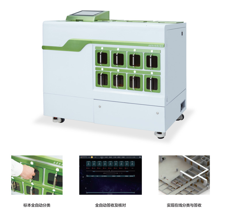 血液標本智能分揀機主要是通過標本號,對血液標本進行全自動分揀及簽收;它的前端可以與標本自動運輸軌道進行連接,后端亦可以連接軌道與實驗室自動流水線直接實現無縫對接。